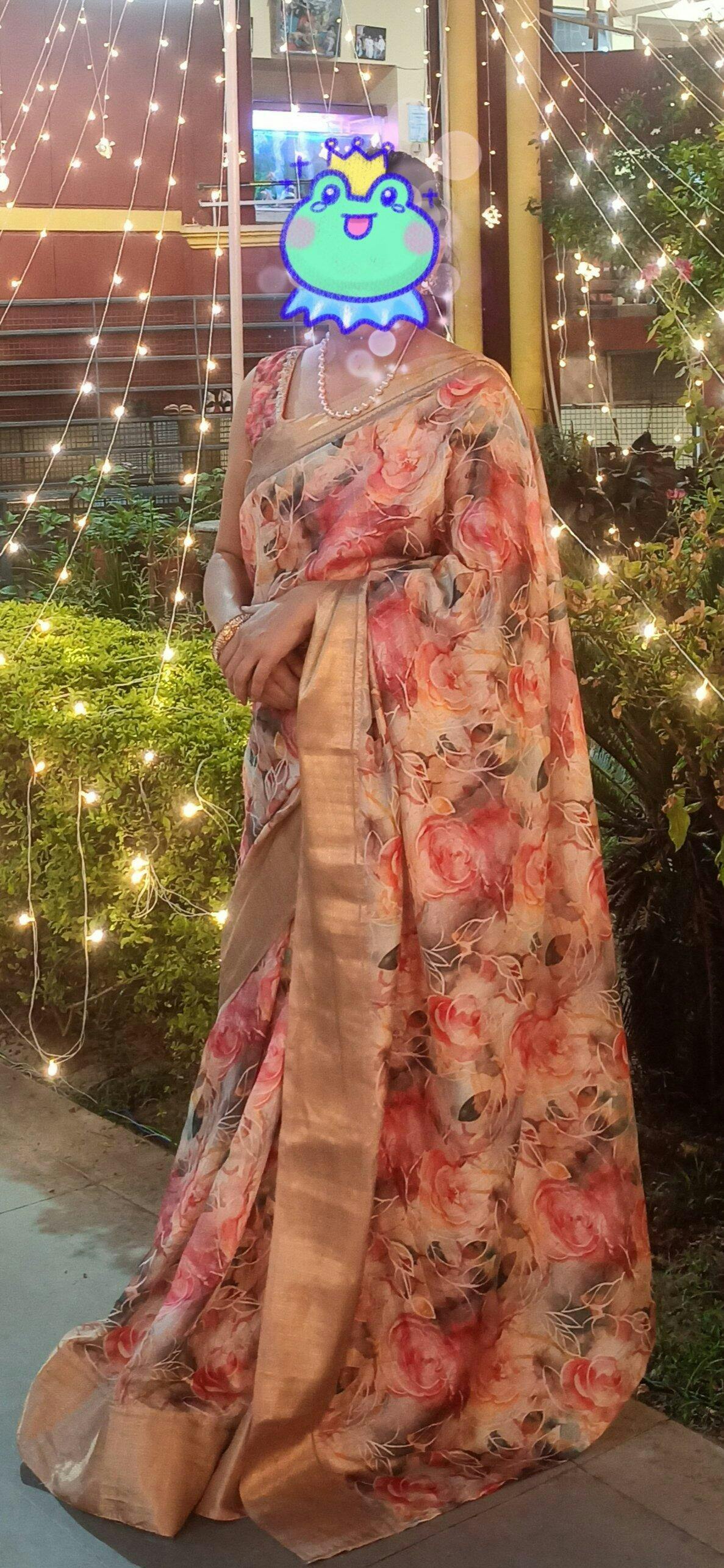 Ready To Wear Peach Dola Silk Woven Border Floral Printed SareeReady To Wear Peach Dola Silk Woven Border Floral Printed Saree